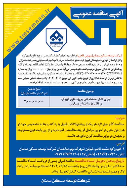 شرکت توسعه مسکن سمنان (سهامی خاص) در نظر دارد اجرای کامل اسکلت بتنی پروژه طلوع فیروزکوه واقع در استان تهران ، شهرستان فیروزکوه ، شهرک دشت ناصر در قالب 5 بلوک مسکونی ، بصورت دستمزدی و 100 درصد تهاتر را از طریق مناقصه عمومی به یک پیمانکار واجد شرایط واگذار نماید.